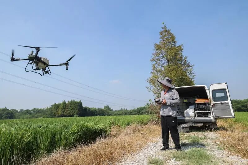 现在用植保无人机,设好线路、一键起飞,十分钟搞定一亩地,省时、省力、还省药。