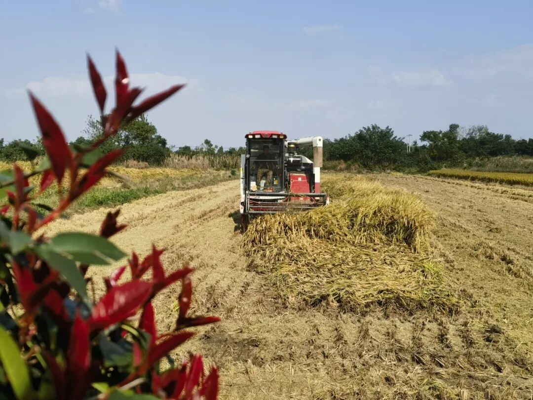 金秋时节,方集村一望无际的稻田里,联合收割机正繁忙作业。伴随着“呜呜”的轰鸣,收割机将老练的粳稻秸秆堵截、传送、脱粒,随后把切碎的秸秆还田,将金黄的稻谷装入农用车。满载稻谷的车辆紧接着驶向烘干房,进行后续处理。