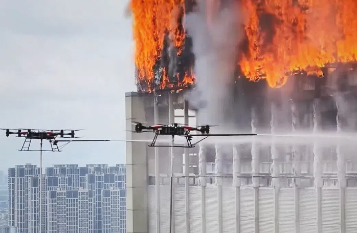 闫怀强:这一架是TD550无人直升机,它载重可以到200公斤。国网很多都需要巡检,比方说高压巡检,以前都是人像走钢丝一样在上面巡查,很危险。现在用这款无人机就能轻松实现空中巡检。在别的行业,比如说应急消防,一般登高车的喷射距离是八九十米。现在无人机可以带水带水枪直接飞到100米以上,直接就把高层的灭火场景覆盖了。